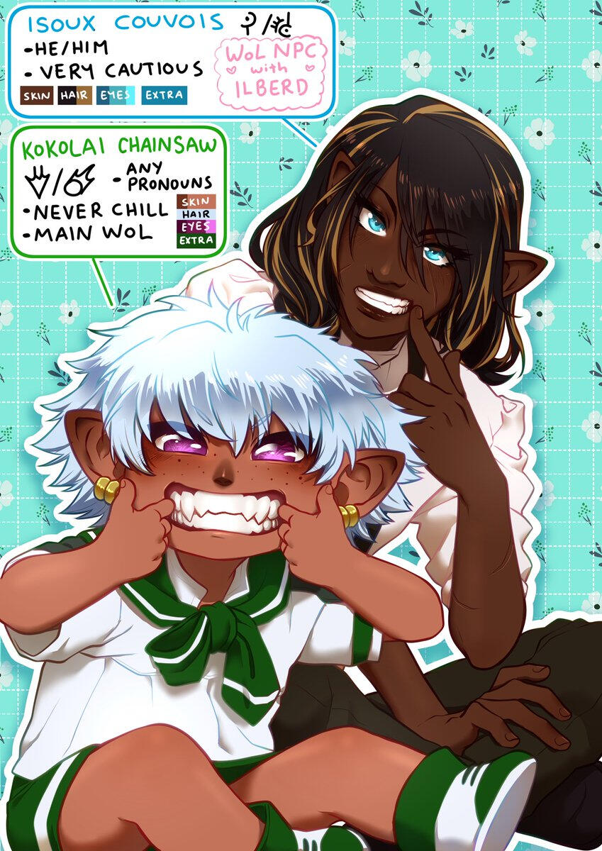 I have two WoLs, and their canons do not interact with each other.Kokolai is my main, the one I personally experience the story through, and the one I play most often.Isoux is my alt made for a specific WoLship, and is the one I draw/talk about most frequently.I love them both a lot, thank you for taking an interest!