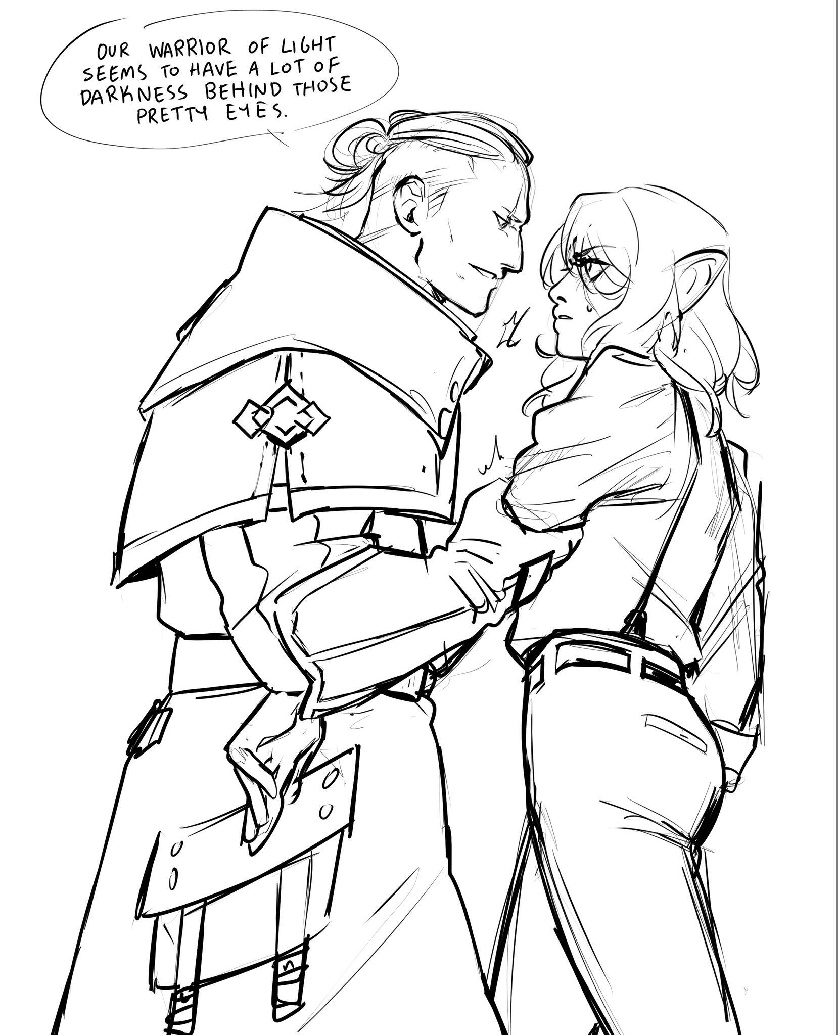 They meet for the first time at Alphinaud's behest, as the Warrior of Light and the second in command of the Crystal Braves, and are immediately attracted to one another. They have enough life experience to not let it show.